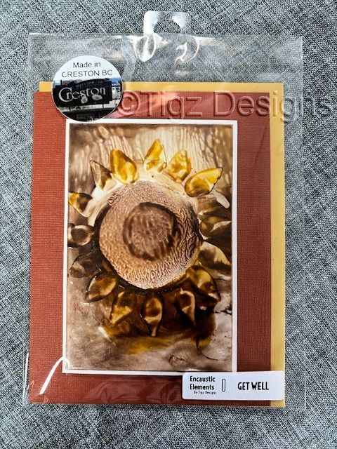 An original encaustic beeswax painting adorns the front of this Get Well card, hand‑crafted by Tigz Designs in Creston, BC. Each Encaustic Elements card is crafted individually, using high‑quality papers and a linen‑lined interior for a lovely writing experience.