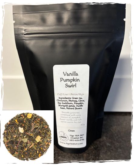 Vanilla Pumpkin Swirl offers the perfect balance of energizing and soothing qualities. The combination of caffeine and L-theanine in green tea is said to provide a stable source of energy, promote mental focus, and help reduce stress. This inviting cup not only invigorates with its gentle caffeine boost but also envelops you in the comforting warmth of vanilla and spices. Ideal for energizing you on cold mornings or cozying up in the afternoon, this tea warms your heart and body with every sip.