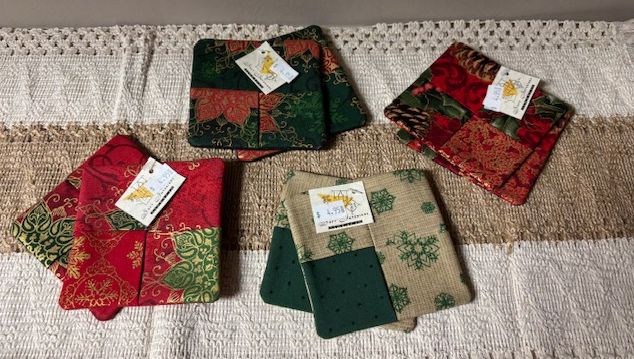 Add a cozy touch to your holiday gatherings with our handmade cloth coasters, crafted with love and care using assorted festive seasonal fabrics. Each set of two features a charming holiday patterns. Think snowflakes, holly, plaid, and cheerful reds and greens. Perfect for dressing up your table or gifting to someone special.