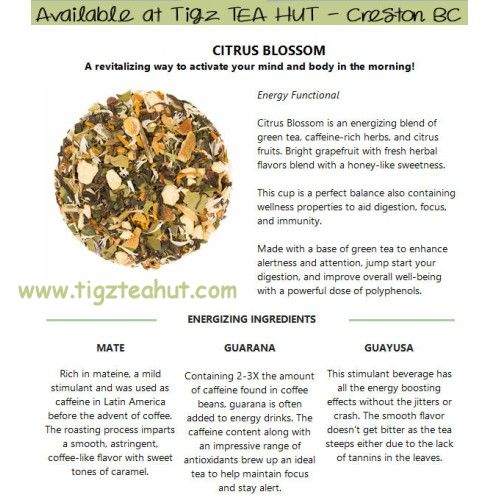 Citrus Blossom is an energizing blend of green tea, caffeine-rich herbs, and citrus fruits. This cup of caffeine comfort is the perfect balance of stimulating herbs that also contains wellness properties to aid digestion, focus, and immunity. A revitalizing way to activate your mind and body in the morning!